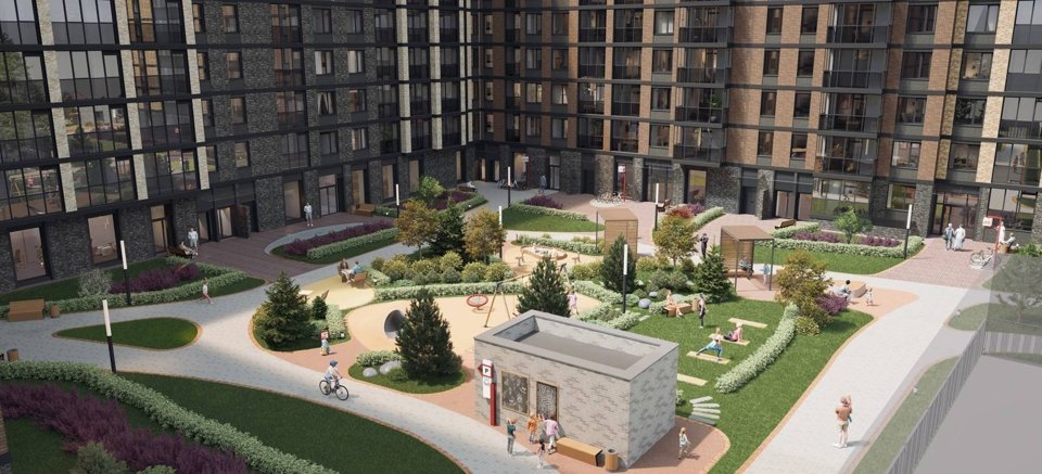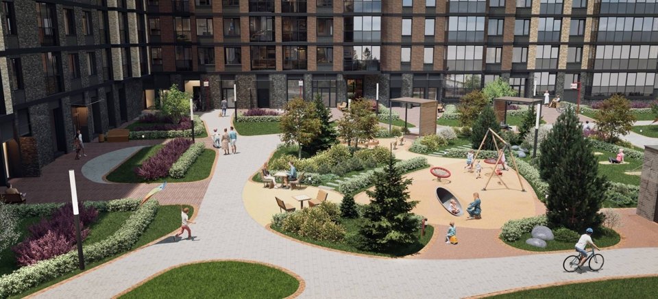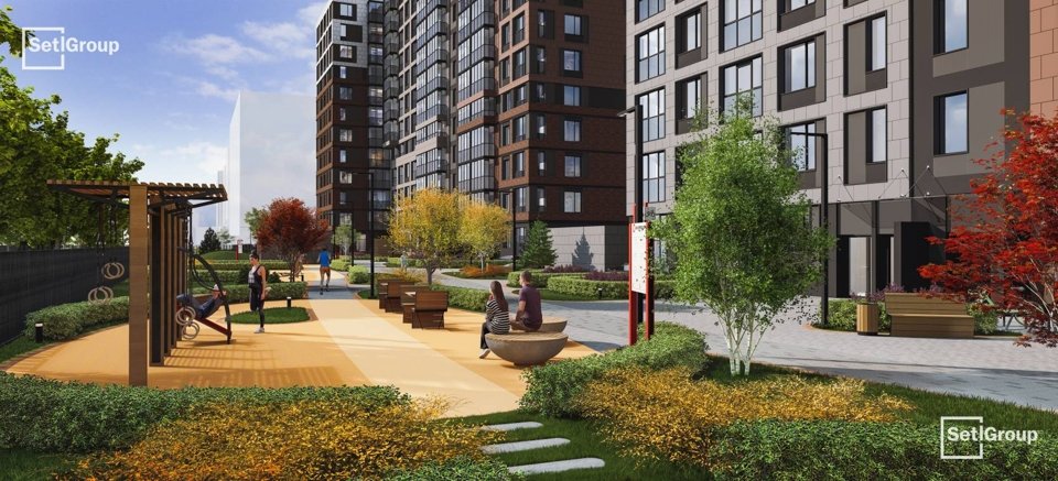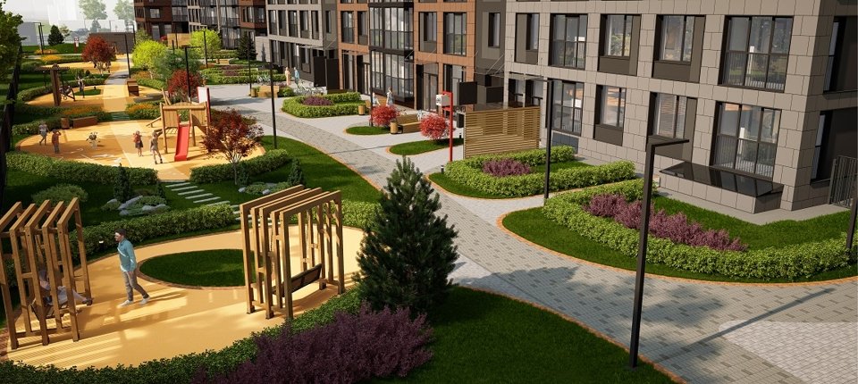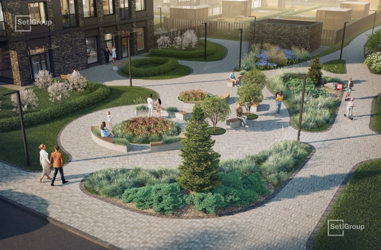 Центром притяжения квартала станет благоустроенный променад протяженностью более 1 км, а со стороны Большого Смоленского проспекта появятся две благоустроенные площади. Пространство украсит эффектный гейзерный фонтан, декоративные кустарники, малые архитектурные формы, а вдоль пешеходного бульвара расположатся общественные пространства с продуманным зонированием и различным наполнением: качели и уютные зоны отдыха для взрослых, детские и спортивные площадки, велодорожка с противоударным покрытием.